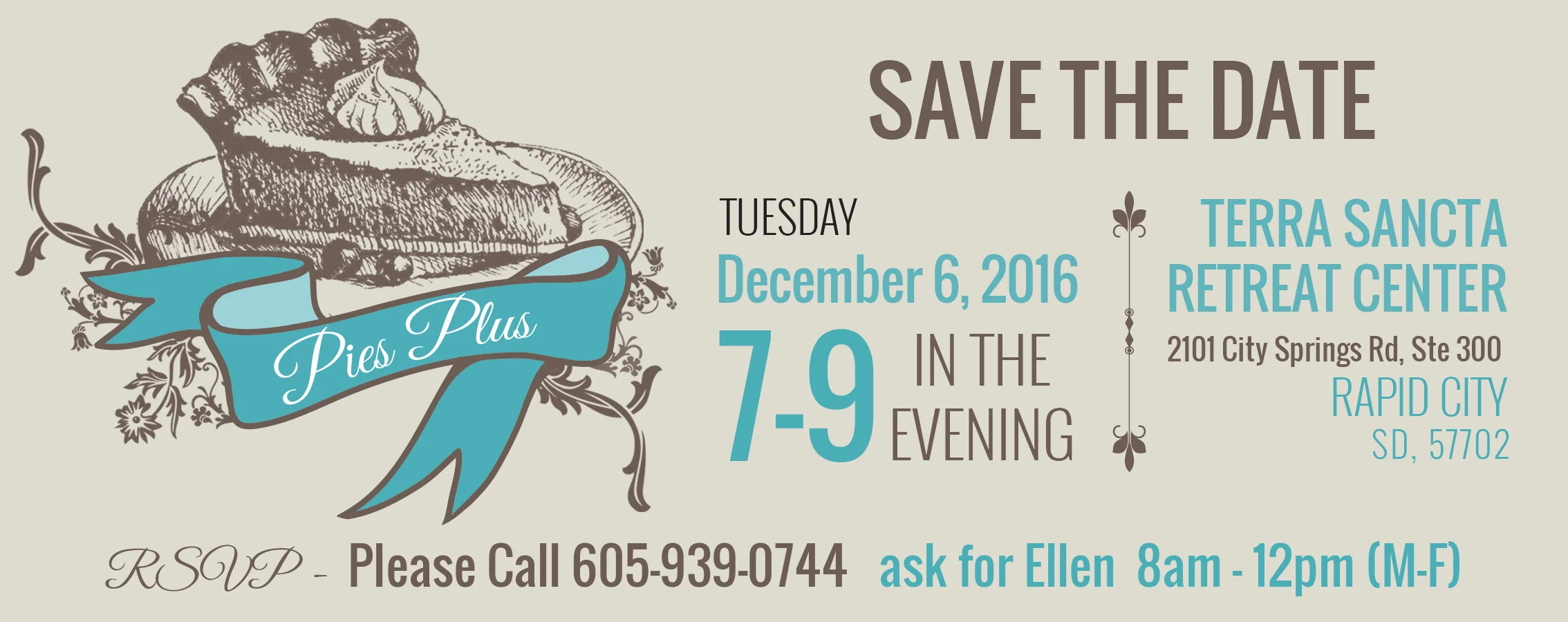 Terra Sancta Retreat Center (map) 2101 City Springs Rd, Ste 300 Rapid City, SD 57702 USA ✚ gCal ✚ iCal Pies, coffee, and updates - Join Passages at the Terra Sancta Retreat Center.Tuesday, December 6, 2016, 7:00 - 9:00 PMFeaturing guest speaker Marty Jackley, SD Attorney GeneralRSVP - Please Call 605-939-0744 ask for Ellen 8am - 12pm (M-F)